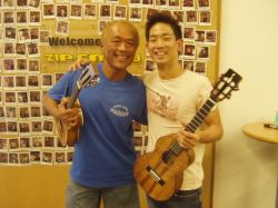 今日はゲストにジェイク・シマブクロがやってきた! 約1年ぶりの再会だ☆ 相変わらずのナイスガイは、場の雰囲気を瞬時にアロハスタイルに変えてしまう。まるで、ハワイの風や海の香りを運んでくるような爽やかさで! ニュー・アルバム「YEAH.」を引っ提げてツアー中のジェイク。名古屋は、今夜アートピアホールで夜7時から♪ |