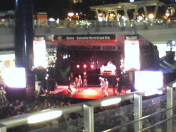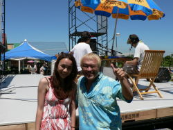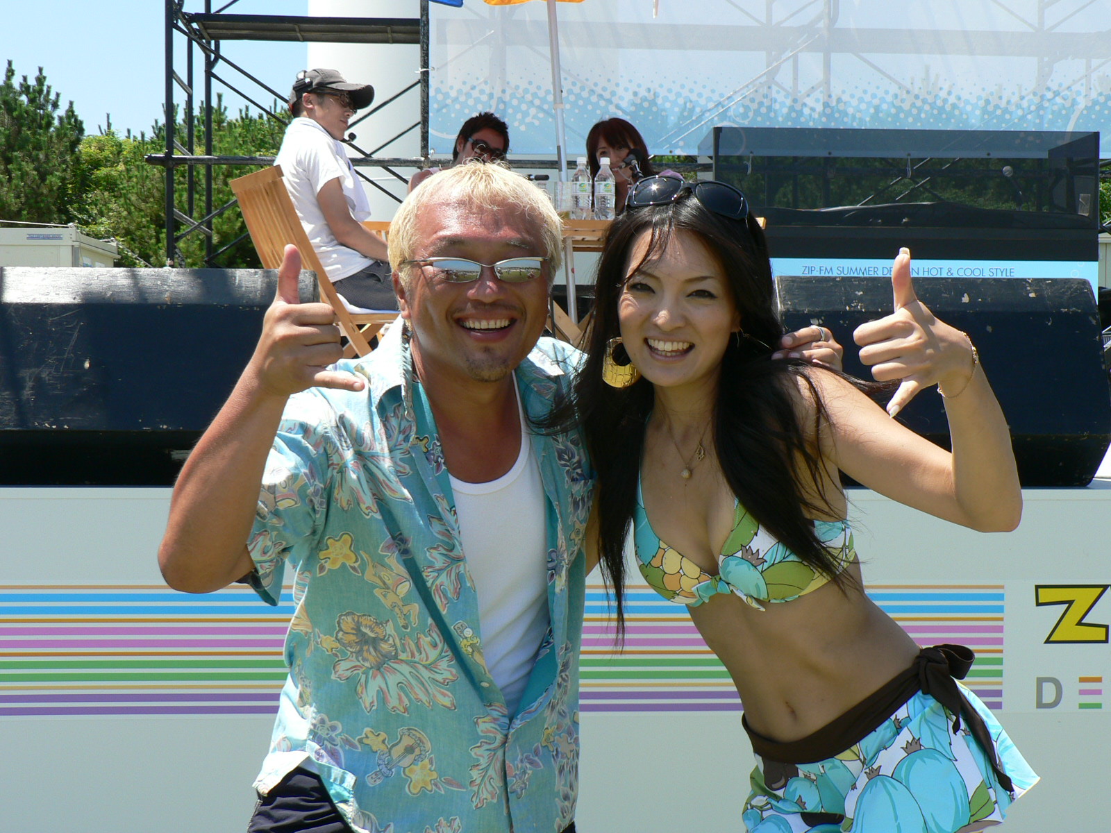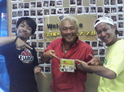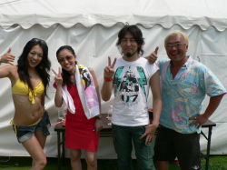 7月26日、今日の新舞子はマジで暑かったぁ〜!!! 曲紹介の時、ちょっと声を張ると「クラッ・・・」ってくるほど(笑) でも、自称「夏の王様」は暑いほど元気になっちゃうのでした♪ 午前チームと午後チームが一緒に写った珍しいショット。左から服部愛子、都築悦子、澤田修、デイル |